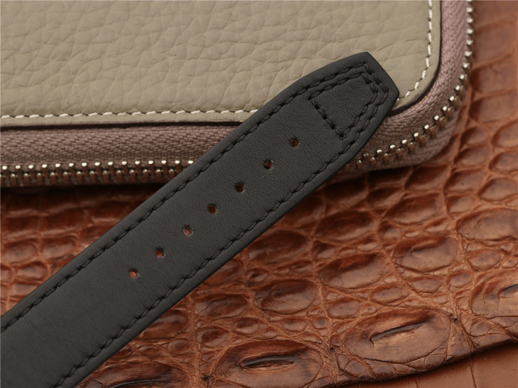 Dây đeo của chiếc IWC Replica này được làm bằng da bê chính hãng, nó có màu đen ở bên ngoài, trong khi mặt sau chạm vào da bạn có màu cam. Toàn bộ dây da có các đường khâu tay màu đen. Khóa trên dây đeo có một bề mặt chải ở mặt trước, trong khi cạnh của nó được đánh bóng trơn tru. Chữ IWC được khắc sâu trên khóa.