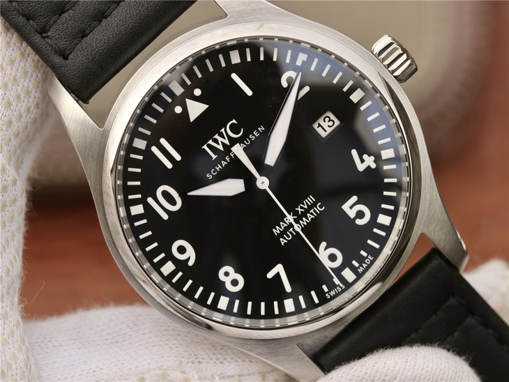 Đồng hồ super fake có mặt số màu đen. Dòng Mark có mặt số đơn giản và thanh lịch nhất trong số tất cả các đồng hồ Pilot. Giống như các mẫu đồng hồ Pilot và Mark khác, mặt số Mark XVIII này có thiết kế rất đơn giản, nhưng khả năng hiển thị rất tốt. Rất nhiều đồng hồ Pilot của các thương hiệu Thụy Sĩ khác cũng đề cập đến thiết kế mặt số của dòng IWC Mark vì nó rất cổ điển. Điểm đánh dấu giờ trắng trên mặt số màu đen làm tăng khả năng đọc của toàn bộ mặt số, điểm đánh dấu hình vuông ở vị trí 3, 6, 9 giờ và dấu tam giác ở 12 giờ được áp dụng với vật liệu phát quang màu trắng, vì vậy, chúng sẽ phát ra ánh sáng màu xanh lá cây mạnh trong điều kiện tối.