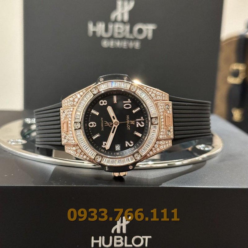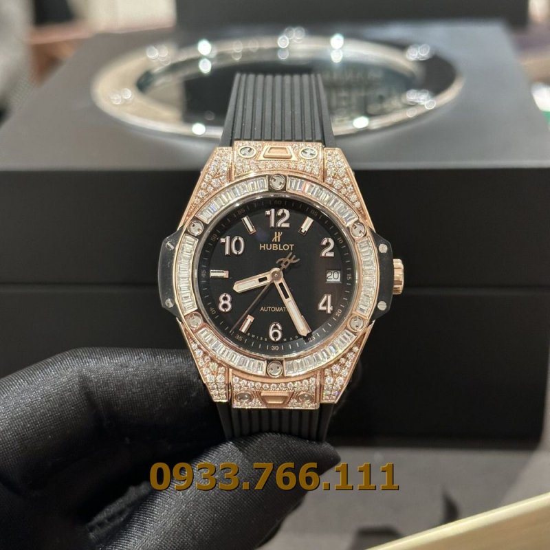 Không chỉ dừng lại ở đó, vành bezel còn được cố định chắc chắn bằng 6 đinh vít Titanium hình chữ H – biểu tượng đặc trưng của thương hiệu Hublot. Titanium là chất liệu nhẹ nhưng cực kỳ bền vững, giúp bảo vệ các chi tiết bên trong đồng hồ khỏi những va đập mạnh mẽ. Sự kết hợp giữa vàng hồng 18k, kim cương moissanite và đinh vít Titanium tạo nên một tổng thể hoàn mỹ, vừa đẹp mắt vừa đảm bảo tính năng sử dụng cao.